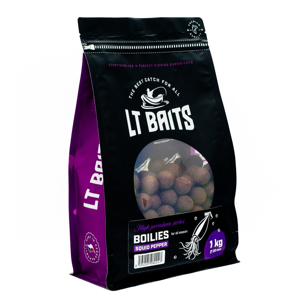 Boilies LT Baits Squid Pepper je špičková nástraha pro lov velkých kaprů v náročných podmínkách. Je postavené na anglické esenci Squid–Octopus, která tvoří základ jeho výrazného masového profilu. Receptura je doplněna o sypký i tekutý pepř, jenž dodává pikantní podtón a zvyšuje atraktivitu i na prochytávaných vodách.