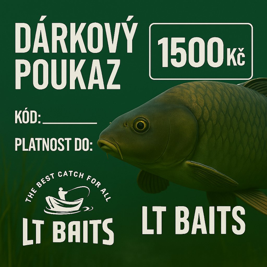 Dárkový poukaz LT Baits v hodnotě 1500 Kč je perfektní dárek pro vášnivého rybáře. Rychlé doručení e‑mailem nebo voucheru v obálce, jednoduché uplatnění na e‑shopu.