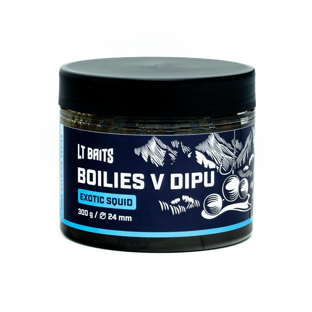 Boilies LT Baits Exotic Squid v dipu je vysoce atraktivní nástraha připravená k okamžitému použití. Každá kulička je dlouhodobě naložená v hustém dipu stejné příchutě, takže je dokonale nasáklá atraktory a začne pracovat okamžitě po dopadu do vody. Ideální pro krátké vycházky, závodní rybolov i lov na zabahněných úsecích.
