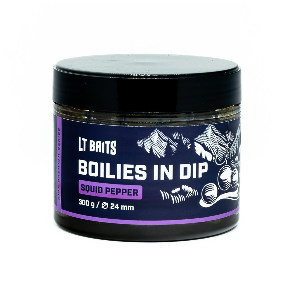 Boilies LT Baits Squid Pepper v dipu spojuje silnou masovou recepturu s jemně kořeněným podtónem. Každá kulička je dlouhodobě naložená v hustém dipu stejné příchutě, takže je dokonale nasáklá atraktory a začne pracovat okamžitě po dopadu do vody. Ideální pro krátké vycházky, závodní rybolov i lov na zabahněných revírech.